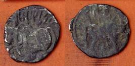 | Description / विवरण | Descrpn./Obv Recumbent bull facing left, wearing jhula (saddle cloth), with trisula (trident) symbol on rump. Above, legend in Sarada script Sri Samantadeva . Descrpn./Rev Rider with lance on caparisoned horse facing right. On left, Sarada letter bhi and on right, Sarada letter ta |