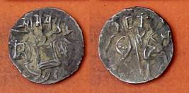 | Description / विवरण | Descrpn./Obv Recumbent bull facing left, wearing jhula (saddle cloth), with trisula (trident) symbol on rump. Above, legend in Sarada script Sri Samantadeva . Descrpn./Rev Rider with lance on caparisoned horse facing right. On left, Sarada letter bhi and on right, Sarada letter ta |