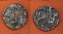 | Description / विवरण | Descrpn./Obv Recumbent bull facing left, wearing jhula (saddle cloth), with trisula (trident) symbol on rump. Above, legend in Sarada script Sri Samantadeva . Descrpn./Rev Rider with lance on caparisoned horse facing right. On left, Sarada letter bhi and on right, Sarada letter ta |