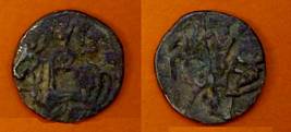 | Description / विवरण | Descrpn./Obv Recumbent bull facing left, wearing jhula (saddle cloth), with trisula (trident) symbol on rump. Above, legend in Sarada script Sri Samantadeva . Descrpn./Rev Rider with lance on caparisoned horse facing right. On left, Sarada letter bhi and on right, Sarada letter ta |