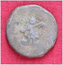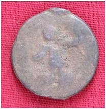 | Description / विवरण | The Shape of the Coin is Circular. Obverse A Standing figure of Kushana type king, with extended right hand and outstretched left hand, wears boots and tunic. Reverse Probably a standing figure of MAO or Moon-God with extended right hand and left hand is not visible, the crescent above the left shoulder. |