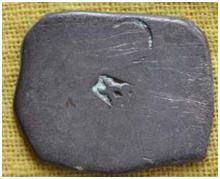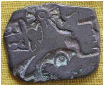 | Description / विवरण | The coin is an imperial type of Punch- marked Coin. The shape of the coin is irregular. Obverse Sun, bull, a standing human figure flanked by two taurines, Six armed wheel. Reverse Crescent, three arched hill with a crescent at the top. |