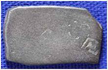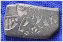 | Description / विवरण | The shape of the coin is pentagonal. Obverse Sun, Six armed wheel, animal, two stupas like object at little distant from each other with to flags and other symbol is indistinct. Reverse One indistinct symbol. |