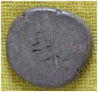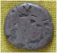 | Description / विवरण | The shape of the coin is circular. Obverse Sun, three arched hill with a crescent at the top, Six armed wheel and other symbol is defaced. Reverse Human and other symbol is indistinct. |