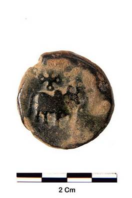 | Description / विवरण | Obverse- Tree in railing on the left, zigzag line on the right below legend Mi ti matas in Brahmi. Reverse- Standing Bull figure towards right side of coin surface , Ujjain symbol above the haunch of the animal. |
