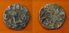 | Description / विवरण | Descrpn./Obv Recumbent bull facing left, wearing jhula (saddle cloth), with trisula (trident) symbol on rump. Above, legend in Sarada script Sri Samantadeva . Descrpn./Rev Rider with lance on caparisoned horse facing right. On left, Sarada letter bhi and on right, Sarada letter ta |