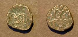 | Description / विवरण | Descrpn./Obv Recumbent bull facing left, wearing jhula (saddle cloth). Above, legend in Sarada script Sri Samantadeva (in cursive letters, mostly truncated and seen partially or off the flan). Descrpn./Rev Rider with lance on caparisoned horse facing right. |