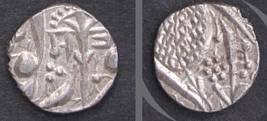 | Description / विवरण | Descrpn./Obv In the centre, a chhatra with Sa and Ta in Gurumukhi script on the left and right of its shaft; traces of the Persian legend seen on the obverse of the bigger Nanakshahi coins of Amritsar mint are also seen. Descrpn./Rev Big peepal leaf and traces of the Persian legend seen on the reverse of the bigger Nanakshahi coins of Amiritsar mint - Shri Amritsarjiv zarb [VS Year] Takht maimanat julus manus Akal Bakht. Especially traces of alif of Akal and te of Takht and maimanat are seen |