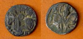 | Description / विवरण | Descrpn./Obv Recumbent bull facing left, wearing jhula (saddle cloth), with trisula (trident) symbol on rump. Above, legend in Sarada script Sri Samantadeva . Descrpn./Rev Rider with lance on caparisoned horse facing right. On left, Sarada letter bhi and on right, Sarada letter ta |
