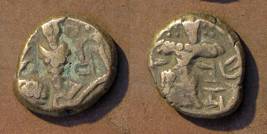 | Description / विवरण | Descrpn./Obv Stylised seated Goddess facing; Sharada legend, Ha (on l.) rsha ra (on r.). Descrpn./Rev Stylised standing king design; Sharada legend, jadeva (on r.) |