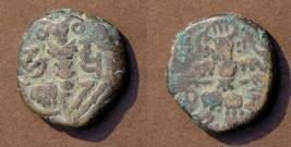 | Description / विवरण | Descrpn./Obv Stylised seated Goddess facing; Sharada legend, Ha (on l.) rsha ra (on r.). Descrpn./Rev Stylised standing king design; Sharada legend, jadeva (on r.) |