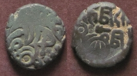 | Description / विवरण | Obverse - Distictive stylized rendition of recumbent bull facing left, above Devanagari sri mahamada sa/ma. Reverse - Distictive stylized rendition of a horse rider facing right . |
