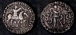 | Description / विवरण | Descrpn./Obv King holding whip, mounted on horse walking right; Greek legend, Basileos Basileon Megalou / Azou. Descrpn./Rev Pallas standing right with shield at left side and spear on left, right hand outstretched ; Kharoshthi legend, Maharajasa rajadirajasa mahatasa / Ayasa |