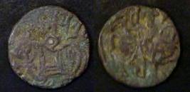 | Description / विवरण | Descrpn./Obv Recumbent bull facing left, wearing jhula (saddle cloth), with trisula (trident) symbol on rump. Above, legend in Sarada script Sri Samantadeva . Descrpn./Rev Rider with lance on caparisoned horse facing right. On left, Sarada letter bhi and on right, Sarada letter ta |