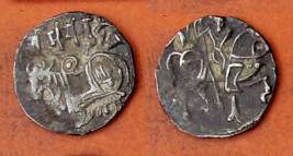 | Description / विवरण | Descrpn./Obv Recumbent bull facing left, wearing jhula (saddle cloth), with trisula (trident) symbol on rump. Above, legend in Sarada script Sri Samantadeva . Descrpn./Rev Rider with lance on caparisoned horse facing right. On left, Sarada letter bhi and on right, Sarada letter ta |