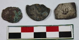 | Description / विवरण | Three metal coins of silver,copper and brass which is completely corroded. Shape of copper and brass coins are irregular and colour is green. Shape of silver coin is almost rectangular and slightly broken. |