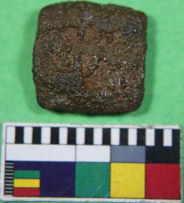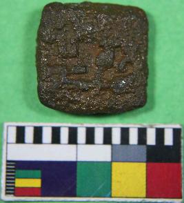 | Description / विवरण | Entirely incrusted fragment of coin with designed carvings having square shape. It has rough surface. |