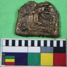 | Description / विवरण | Fragment of coin with glittering gold effect and designed carvings having square shape. It has rough surface. |
