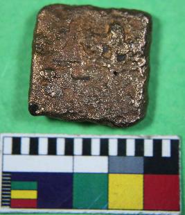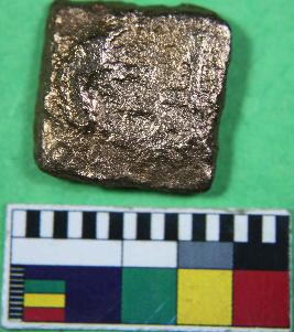 | Description / विवरण | Fragment of coin with glittering gold effect and designed carvings having square shape. It has rough surface. |