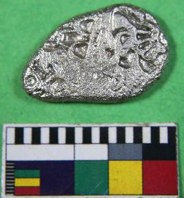 | Description / विवरण | Silver punch mark coin with symbols of three dots,mountain and triratna on obverse and some disgn on reverse,square in shape. |