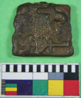 | Description / विवरण | A copper coin having square shape elephant to left facing, triangle headed standard, platform below; swastika and makar above the elephant inscribed on obverse side and reverse side tree in railing; hollow cross & chaitya to left ; taurine above inscribed on it. Its colour is dark copper and smooth surface. |