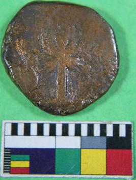 | Description / विवरण | A copper coin having circular shape. On the obverse side, a humped bull image and in front of it a spear head is inscribed. On its reverse side, a tree image is inscribed. Its colour is brown and smooth surface. |