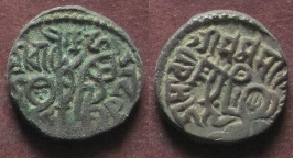 | Description / विवरण | Obverse- Recumbent bull, facing left; Devanagari asavari/sri samasorala devi. Reverse- Rider bearing lance on caparisoned horse facing right. Devanagari sri ca/hada deva. |