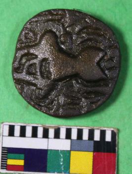 | Description / विवरण | A copper coin having irregular circular shape with some animal figure inscribed on obverse and reverse side. Its colour is dark copper and surface is fine. |