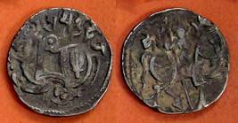 | Description / विवरण | Descrpn./Obv Recumbent bull facing left, wearing jhula (saddle cloth), with trisula (trident) symbol on rump. Above, legend in Sarada script Sri Samantadeva . Descrpn./Rev Rider with lance on caparisoned horse facing right. On left, Sarada letter bhi and on right, Sarada letter ta |