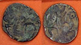 | Description / विवरण | Descrpn./Obv Recumbent bull facing left, wearing jhula (saddle cloth), with trisula (trident) symbol on rump. Above, legend in Sarada script Sri Samantadeva . Descrpn./Rev Rider with lance on caparisoned horse facing right. On left, Sarada letter bhi and on right, Sarada letter ta |