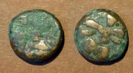 | Description / विवरण | Descrpn./Obv Stylised seated Goddess facing (Details and legend rubbed off/ worn out). Descrpn./Rev Stylised standing king design (Details and legend rubbed off/ worn out) |