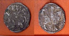 | Description / विवरण | Descrpn./Obv Recumbent bull facing left, wearing jhula (saddle cloth), with trisula (trident) symbol on rump. Above, legend in Sarada script Sri Samantadeva . Descrpn./Rev Rider with lance on caparisoned horse facing right. On left, Sarada letter bhi and on right, Sarada letter ta |