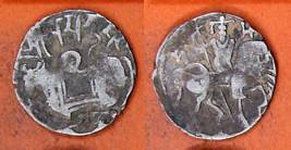 | Description / विवरण | Descrpn./Obv Recumbent bull facing left, wearing jhula (saddle cloth), with trisula (trident) symbol on rump. Above, legend in Sarada script Sri Samantadeva . Descrpn./Rev Rider with lance on caparisoned horse facing right. On left, Sarada letter bhi and on right, Sarada letter ta |