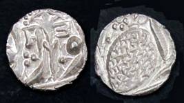 | Description / विवरण | Descrpn./Obv In the centre, a chhatra with Sa and Ta in Gurumukhi script on the left and right of its shaft; traces of the Persian legend seen on the obverse of the bigger Nanakshahi coins of Amritsar mint are also seen. Descrpn./Rev Big peepal leaf and traces of the Persian legend seen on the reverse of the bigger Nanakshahi coins of Amiritsar mint - Shri Amritsarjiv zarb [VS Year] Takht maimanat julus manus Akal Bakht. Especially traces of alif of Akal and te of Takht and maimanat are seen |