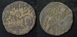 | Description / विवरण | Descrpn./Obv Recumbent bull facing left, wearing jhula (saddle cloth), with trisula (trident) symbol on rump. Above, legend in Sarada script Sri Samantadeva . Descrpn./Rev Rider with lance on caparisoned horse facing right. On left, Sarada letter bhi and on right, Sarada letter ta |