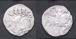 | Description / विवरण | Descrpn./Obv Recumbent bull facing left, wearing jhula (saddle cloth), with trisula (trident) symbol on rump. Above, legend in Sarada script Sri Samantadeva . Descrpn./Rev Rider with lance on caparisoned horse facing right. On left, Sarada letter bhi and on right, Sarada letter ta |