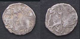 | Description / विवरण | Descrpn./Obv Recumbent bull facing left, wearing jhula (saddle cloth), with trisula (trident) symbol on rump. Above, legend in Sarada script Sri Samantadeva . Descrpn./Rev Rider with lance on caparisoned horse facing right. On left, Sarada letter bhi and on right, Sarada letter ta |