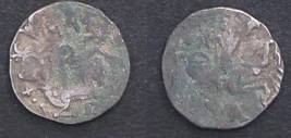 | Description / विवरण | Descrpn./Obv Recumbent bull facing left, wearing jhula (saddle cloth), with trisula (trident) symbol on rump. Above, legend in Sarada script Sri Samantadeva . Descrpn./Rev Rider with lance on caparisoned horse facing right. On left, Sarada letter bhi and on right, Sarada letter ta |