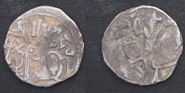 | Description / विवरण | Descrpn./Obv Recumbent bull facing left, wearing jhula (saddle cloth), with trisula (trident) symbol on rump. Above, legend in Sarada script Sri Samantadeva . Descrpn./Rev Rider with lance on caparisoned horse facing right. On left, Sarada letter bhi and on right, Sarada letter ta |