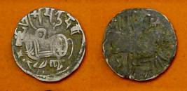 | Description / विवरण | Descrpn./Obv Recumbent bull facing left, wearing jhula (saddle cloth), with trisula (trident) symbol on rump. Above, legend in Sarada script Sri Samantadeva . Descrpn./Rev Rider with lance on caparisoned horse facing right. On left, Sarada letter bhi and on right, Sarada letter ta |