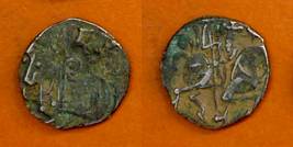| Description / विवरण | Descrpn./Obv Recumbent bull facing left, wearing jhula (saddle cloth), with trisula (trident) symbol on rump. Above, legend in Sarada script Sri Samantadeva . Descrpn./Rev Rider with lance on caparisoned horse facing right. On left, Sarada letter bhi and on right, Sarada letter ta |