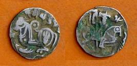 | Description / विवरण | Descrpn./Obv Recumbent bull facing left, wearing jhula (saddle cloth), with trisula (trident) symbol on rump. Above, legend in Sarada script Sri Samantadeva . Descrpn./Rev Rider with lance on caparisoned horse facing right. On left, Sarada letter bhi and on right, Sarada letter ta |