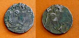 | Description / विवरण | Descrpn./Obv Recumbent bull facing left, wearing jhula (saddle cloth), with trisula (trident) symbol on rump. Above, legend in Sarada script Sri Samantadeva . Descrpn./Rev Rider with lance on caparisoned horse facing right. On left, Sarada letter bhi and on right, Sarada letter ta |