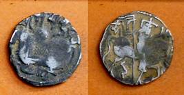 | Description / विवरण | Descrpn./Obv Recumbent bull facing left, wearing jhula (saddle cloth), with trisula (trident) symbol on rump. Above, legend in Sarada script Sri Samantadeva . Descrpn./Rev Rider with lance on caparisoned horse facing right. On left, Sarada letter bhi and on right, Sarada letter ta |