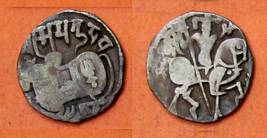 | Description / विवरण | Descrpn./Obv Recumbent bull facing left, wearing jhula (saddle cloth), with trisula (trident) symbol on rump. Above, legend in Sarada script Sri Samantadeva . Descrpn./Rev Rider with lance on caparisoned horse facing right. On left, Sarada letter bhi and on right, Sarada letter ta |