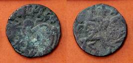 | Description / विवरण | Descrpn./Obv Recumbent bull facing left, wearing jhula (saddle cloth), with trisula (trident) symbol on rump. Above, legend in Sarada script Sri Samantadeva . Descrpn./Rev Rider with lance on caparisoned horse facing right. On left, Sarada letter bhi and on right, Sarada letter ta |