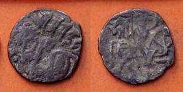 | Description / विवरण | Descrpn./Obv Recumbent bull facing left, wearing jhula (saddle cloth), with trisula (trident) symbol on rump. Above, legend in Sarada script Sri Samantadeva . Descrpn./Rev Rider with lance on caparisoned horse facing right. On left, Sarada letter bhi and on right, Sarada letter ta |