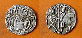 | Description / विवरण | Descrpn./Obv Recumbent bull facing left, wearing jhula (saddle cloth), with trisula (trident) symbol on rump. Above, legend in Sarada script Sri Samantadeva . Descrpn./Rev Rider with lance on caparisoned horse facing right. On left, Sarada letter bhi and on right, Sarada letter ta |