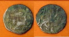 | Description / विवरण | Descrpn./Obv Recumbent bull facing left, wearing jhula (saddle cloth), with trisula (trident) symbol on rump. Above, legend in Sarada script Sri Samantadeva . Descrpn./Rev Rider with lance on caparisoned horse facing right. On left, Sarada letter bhi and on right, Sarada letter ta |