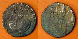 | Description / विवरण | Descrpn./Obv Recumbent bull facing left, wearing jhula (saddle cloth), with trisula (trident) symbol on rump. Above, legend in Sarada script Sri Samantadeva . Descrpn./Rev Rider with lance on caparisoned horse facing right. On left, Sarada letter bhi and on right, Sarada letter ta |